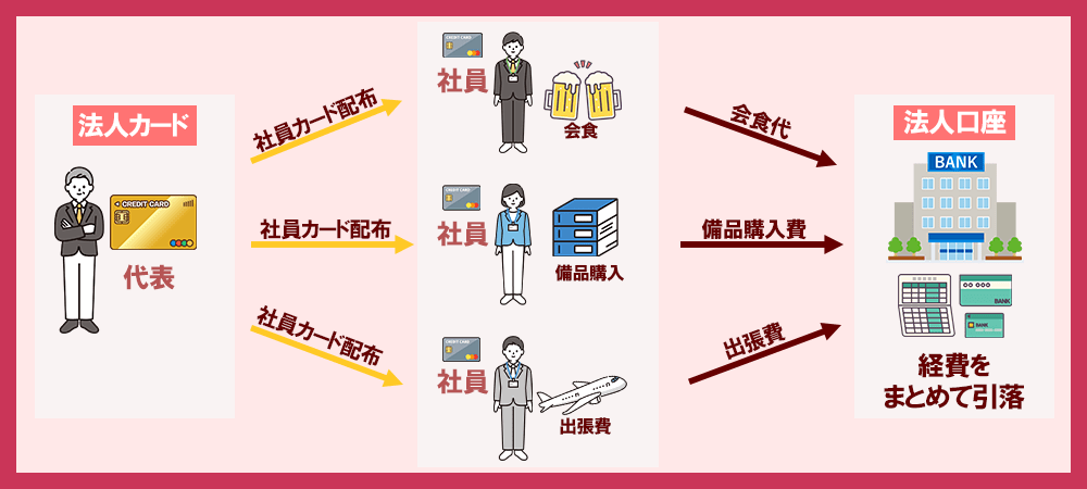 代表者だけでなく、法人カードを従業員に持たせておいて消耗品や備品の購入、出張費の精算など会社で必要なものを決済するときに使用させることもできます。(引き落としは会社の口座となります。)