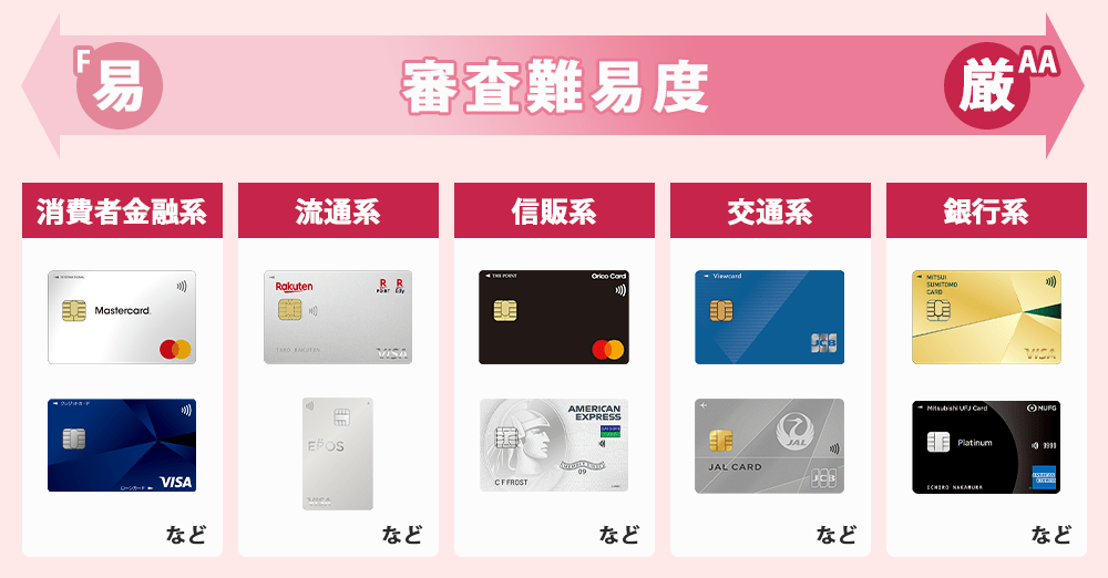 アンケートや口コミを元に、数十種類以上に及ぶクレジットカードの審査難易度をF〜AAの7ランクに分類してみました。