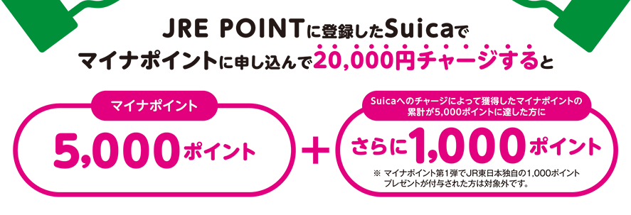 Suicaではマイナポイントを登録して20000円のチャージをした場合+1000円のJREポイントを受け取ることができます。