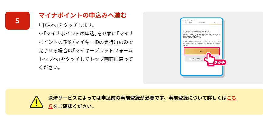 選択しようと考えているキャッシュレス決済の中にはマイナポイントの申し込み前に事前登録が必要なものがあります。