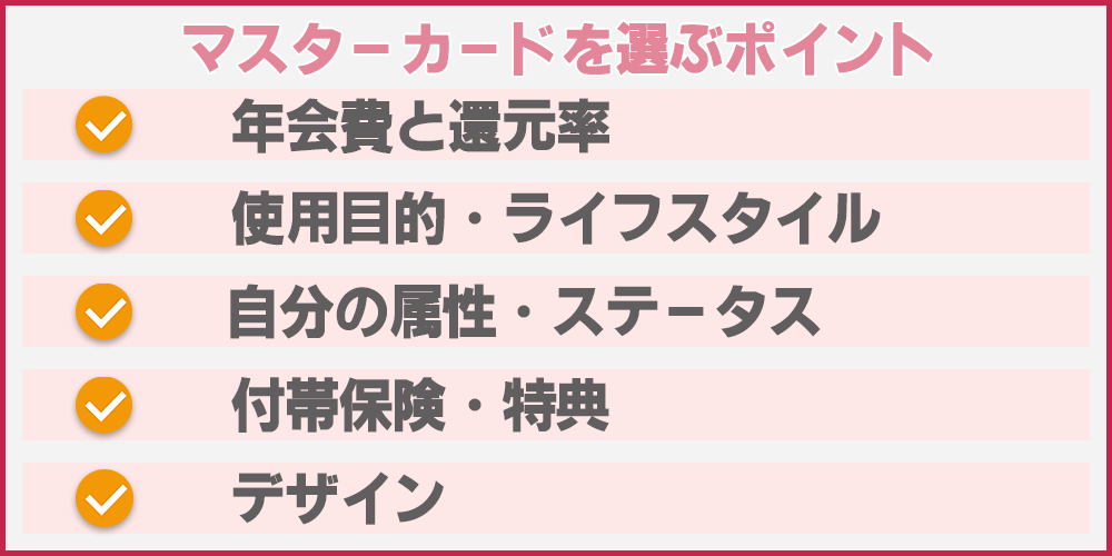 自分に合った一枚を見つけるためには、いくつかのポイントを整理したうえで比較することが大切です。ここでは、マスターカードを選ぶ際に押さえておきたい5つの観点をご紹介します。
