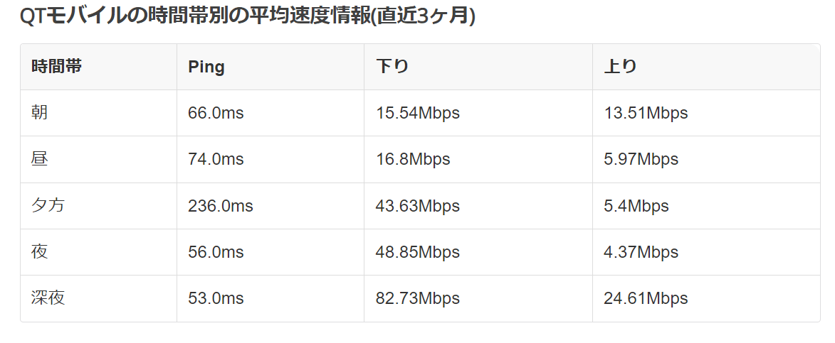 QTモバイルはMVNOということで基本的にお昼などの混み合いやすい時間帯は速度が下がりやすいと考えられますが、2023年3月時点だとスピードテスト結果のデータが好調でした。
