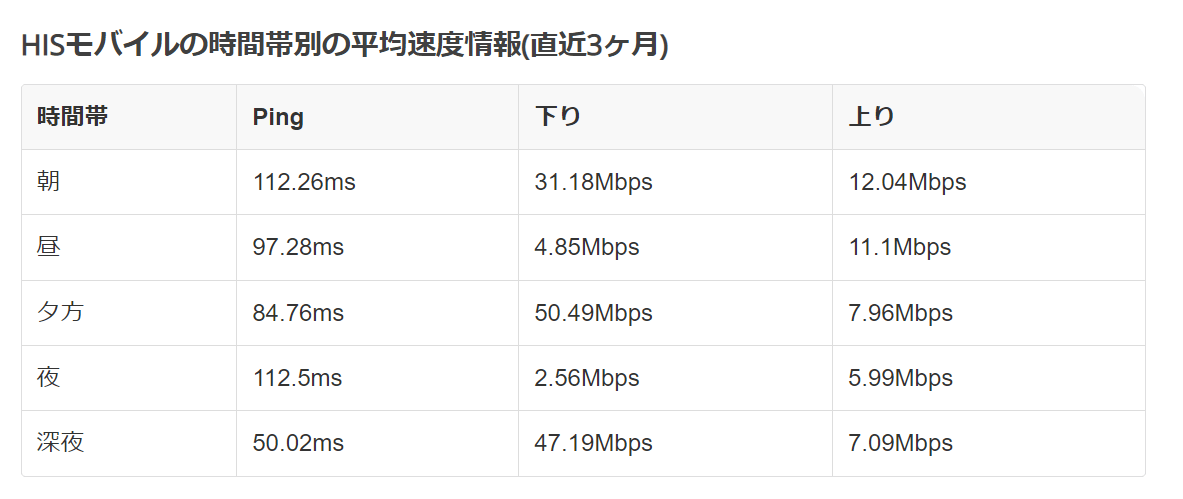 HISモバイルはドコモ回線やソフトバンク回線の格安SIMですが、大手キャリアから回線の一部を借りてサービスを提供しているMVNO系なのでどうしても混み合うお昼や夜は速度が下がりやすい傾向にあります。