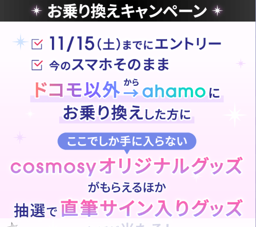 2025年11月15日までにエントリーし他社からahamoへ乗り換えると、cosmosyオリジナルグッズと5,000dポイントがもらえます。