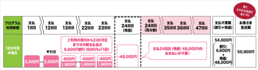 23ヶ月目までに返却をしなくても、その後返却をした時点で再分割された後の支払い(25ヶ月目〜48ヶ月目)が免除されます。(返却時点で未払い分の分割金が免除)