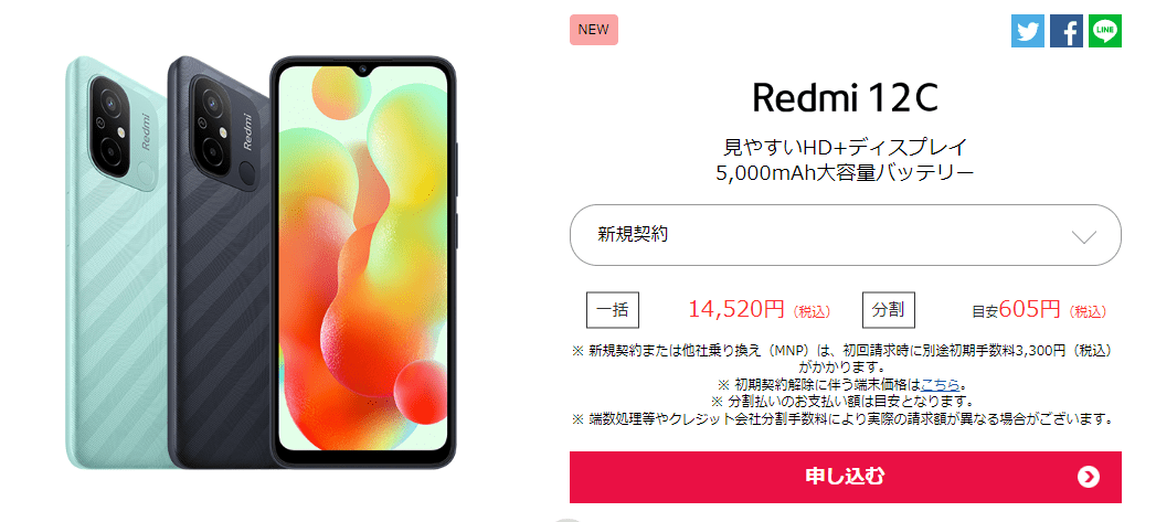 OCNモバイルONEではSIMフリースマートフォンを多数取り揃えていて、例えば「Redmi 12C」を14,520円で購入できます。