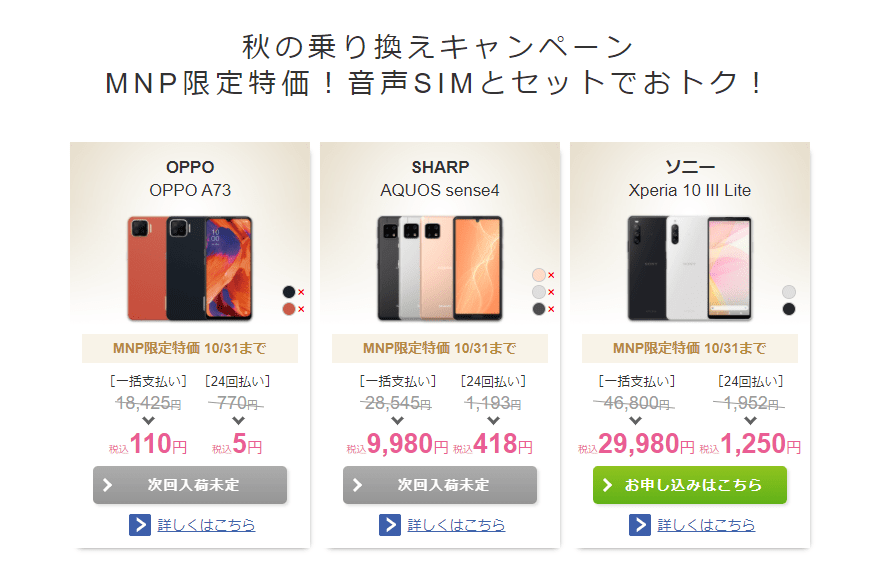 IIJmioは他社からの乗り換えを条件にAndroidスマホなどを特価販売しています。