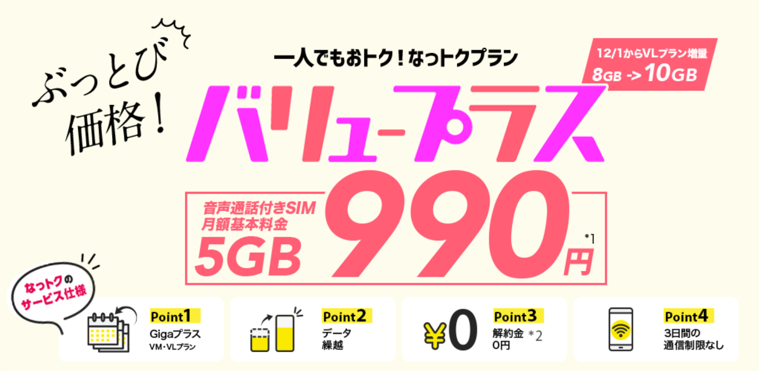 また新プラン「バリュープラス」の5GB(VMプラン)、8GB(VLプラン)には、3ヶ月ごとにボーナスのデータ容量がプレゼントされます。