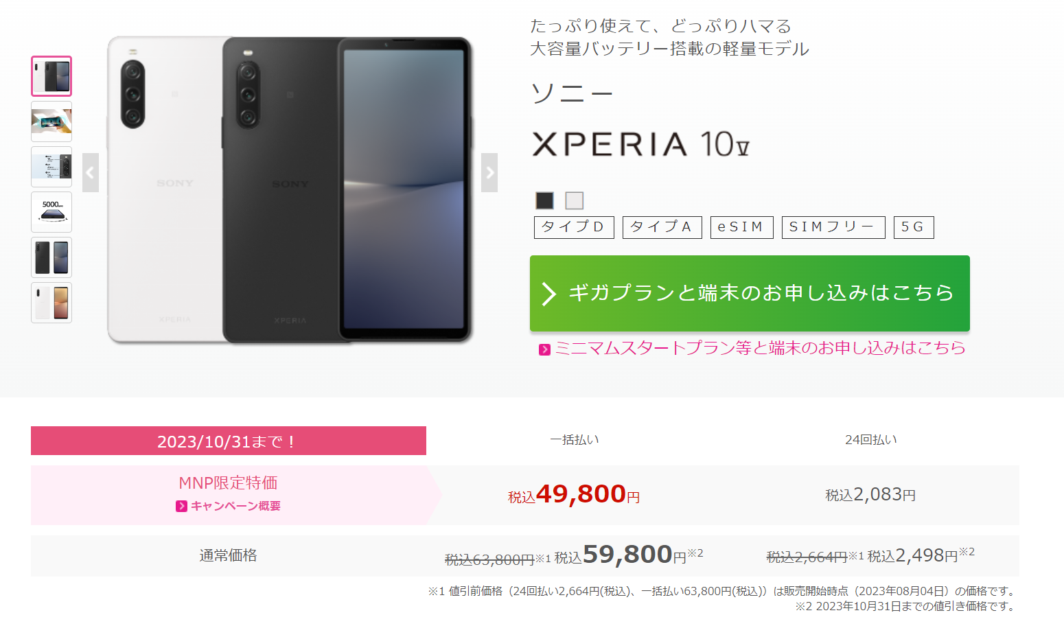 販売価格は通常110,000円ですがMNPで一括99,800円、分割4,163円です。