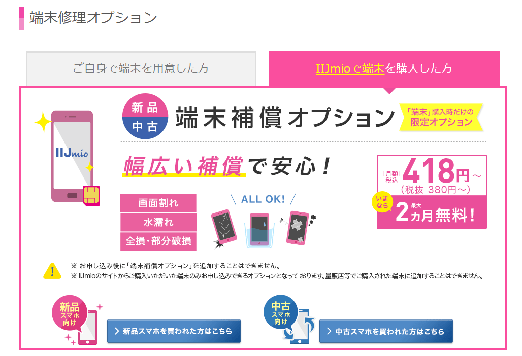 - 端末補償オプション:月額418円~。IIJmioで購入したスマホが対象