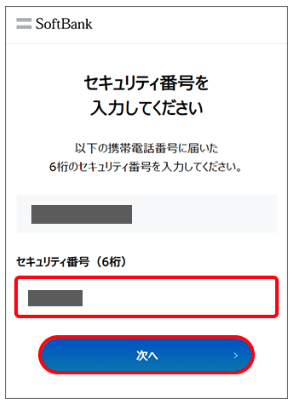 4桁の暗証番号を正しく入力できると、携帯番号宛にSMS(メール)にて6桁のセキュリティ番号が届きます。