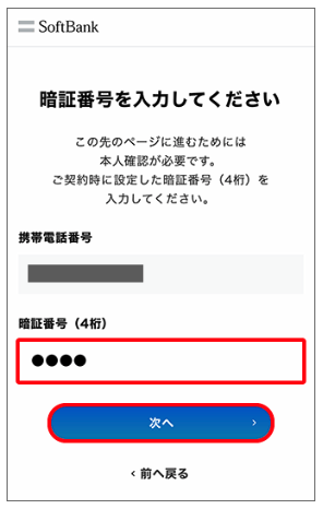 この画面で、4桁の暗証番号を入力します。この暗証番号はソフトバンクとの契約を始めた時に設定したものです。