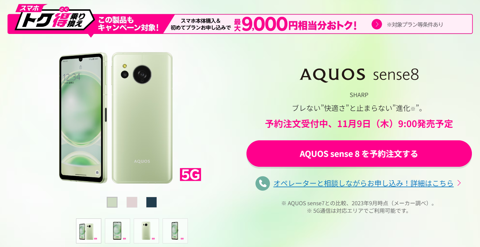 ソフトバンクではAQUOS sense8を販売していないので、AQUOS sense8を購入する際はドコモ、au、UQモバイル、楽天モバイルなどでの購入となります。