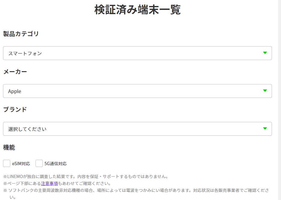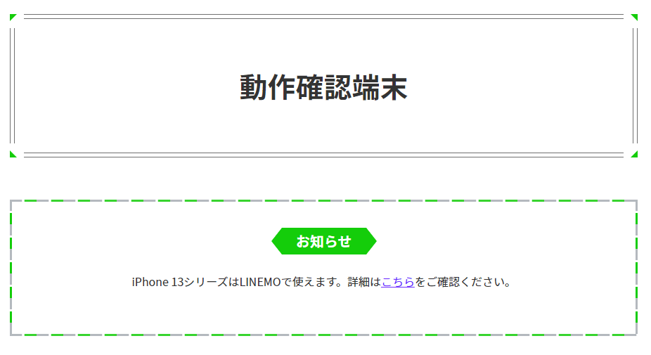 LINEMO側で動作確認されている端末は、LINEMO公式サイトの「動作確認端末」の項目からチェックできます。