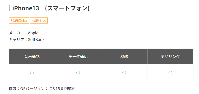 動作確認内容の項目では、音声通話やデータ通信、SMS、テザリングといった動作が行えたかどうかがまとめられています。