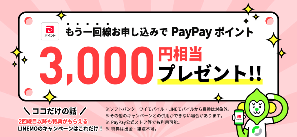 LINEMOでは、1人で2回線目以降の申し込みをした場合にPayPayポイントが3,000円分もらえるキャンペーンが開催されています。