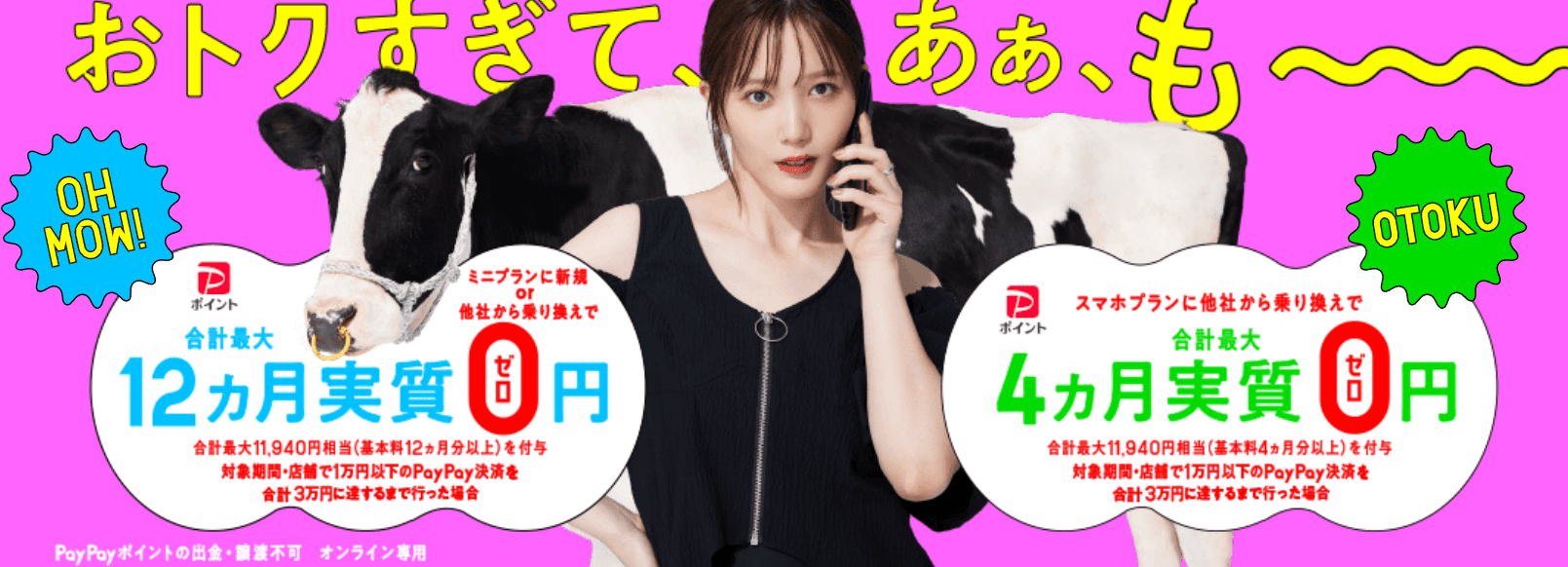 - 1回線目の申込みならPayPayポイント還元によりミニプランは12ヶ月実質無料、スマホプランは4ヶ月実質無料で使えるキャンペーンを開催