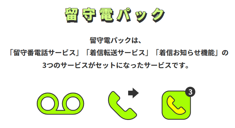 • 留守電パックには留守番電話サービスと転送電話、着信のお知らせ機能の3つが含まれている