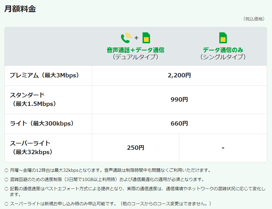 Webサイトの閲覧やLINE、メール程度を使う程度であれば速度が最大300kbpsの「ライト(660円)」、動画再生などもある程度行いたいのであれば最大1.5Mbpsの「スタンダード(990円)」などがおすすめです。