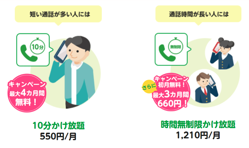 また、専用アプリなしでも使えるかけ放題サービスがあり、無制限かけ放題は月額1,210円・10分かけ放題なら550円で使うことができますよ。