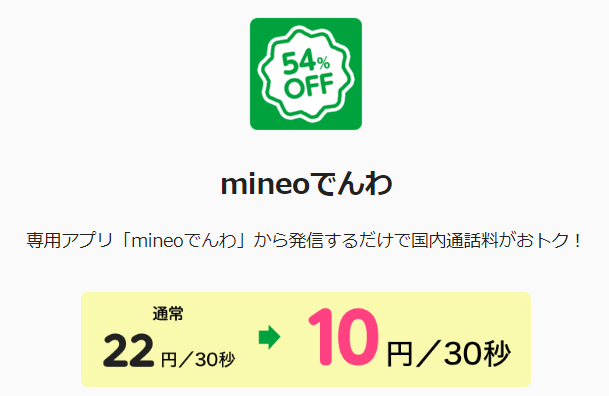 mineoの通話料金は通常30秒22円で一般的な大手キャリアと同額ですが、「mineoでんわ」のアプリから電話をかければ30秒10円で通話が行えます。