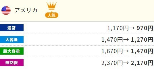 グローバルWiFiを例に解説すると、アメリカでの利用料金は1日970円で300MB、無制限なら1日2,170円となっています。