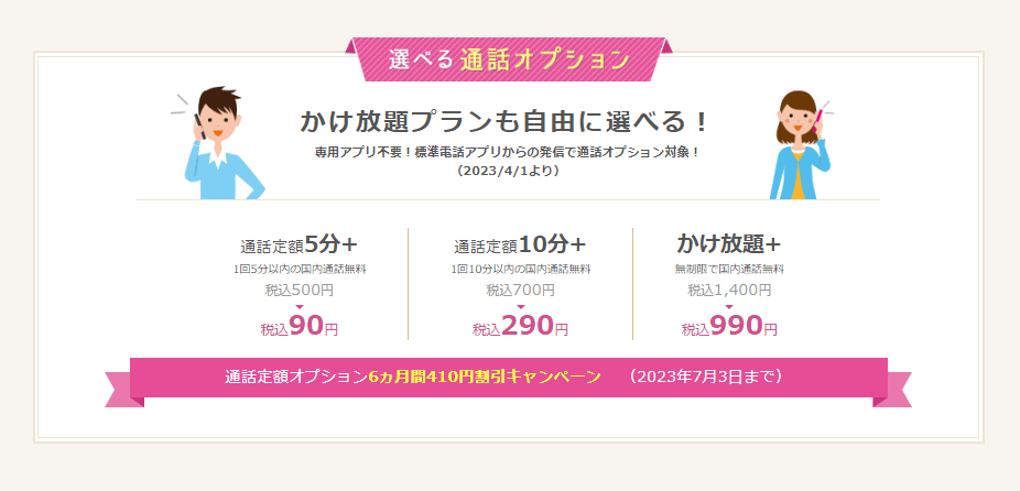 | 通話定額5分+ | 500円 | 5分以内の通話がかけ放題 |