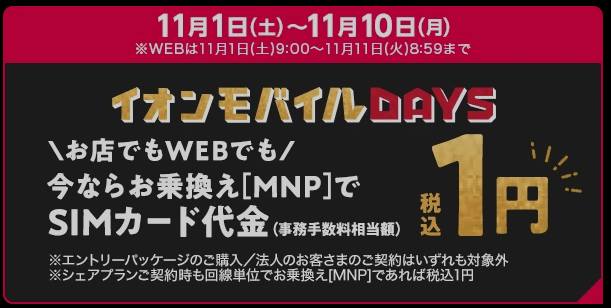 - 乗り換えでSIMカード代金が1円(2025年11月10日まで※WEBは2025年11月11日8:59)
