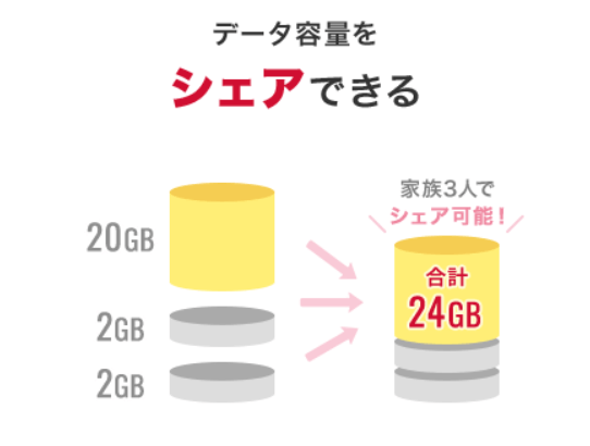 例えば、家族3人でBIC SIMをそれぞれが2GB、2GB、20GB契約していた場合、合計で24GBを10人でシェアすることが可能です。
