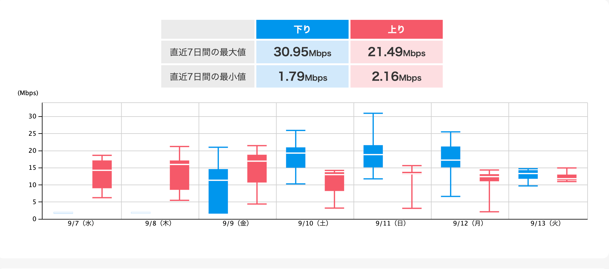 公式によりますと、通信速度は225Mbps/50Mbps(下り/上り)となっていますので、実測値はこの数値よりも劣ると考えていいでしょう。