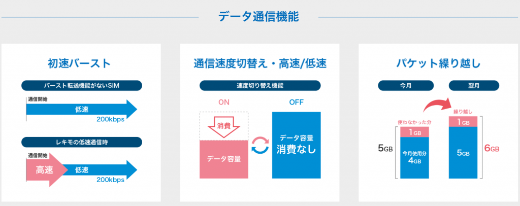通常、制限がかかると200kbpsでの通信しかできなくなってしまいますが、初速バーストは制限状態で通信を開始した際の初速が高速になります。