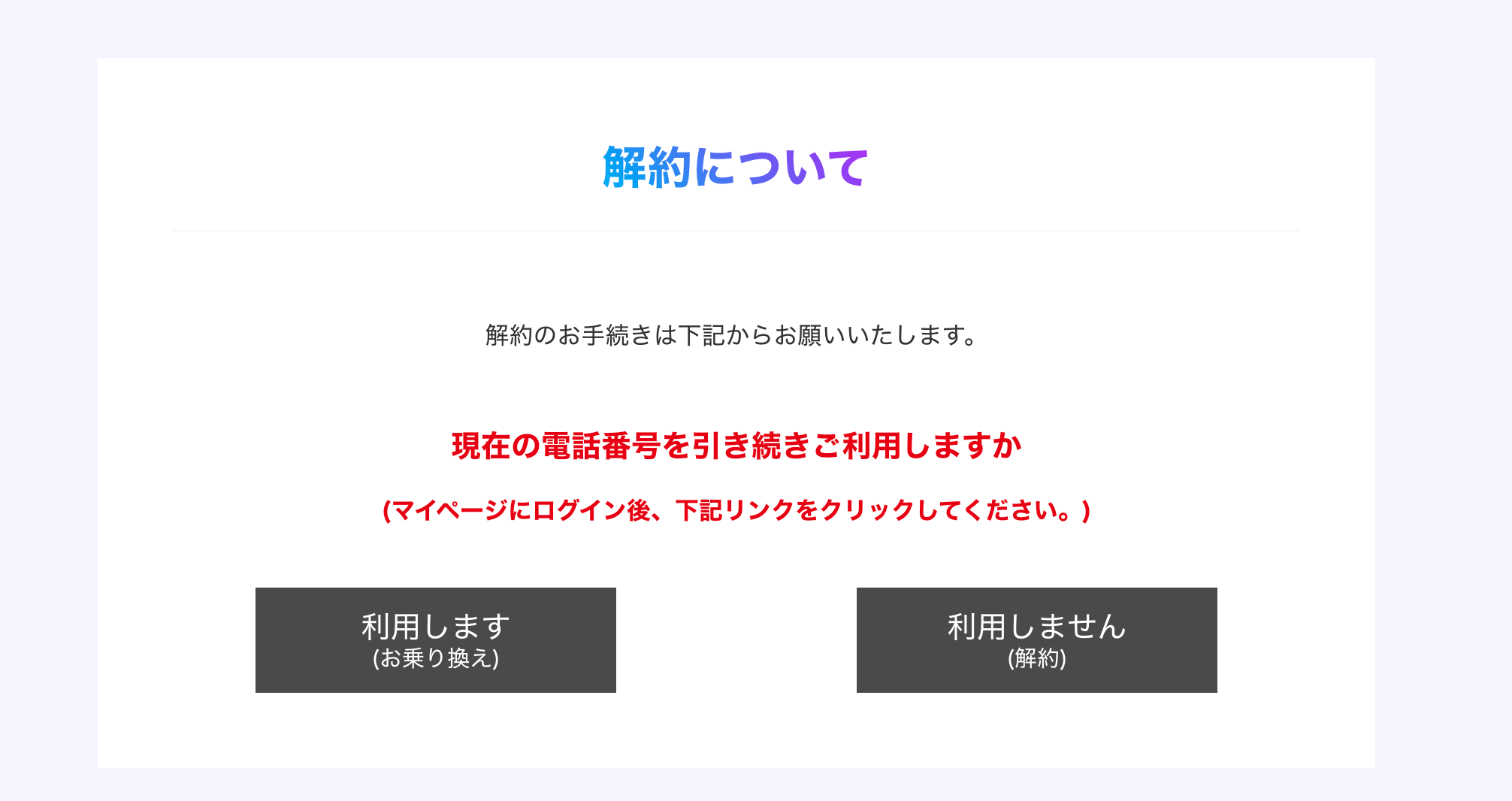 続いて、マイページにログインできたら、「よくある質問」→「解約について」と進んでいき電話番号をそのまま使用するか否かを選択しましょう。