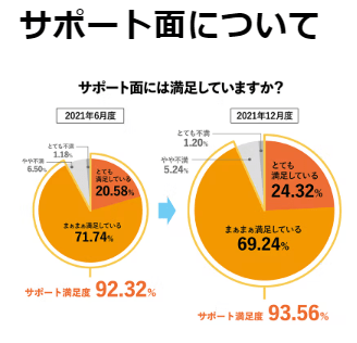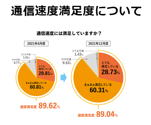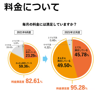 料金満足度は、95%以上とかなり高くなっています。また、「とても満足している」と答えた方が2021年6月より約2倍に増えています。