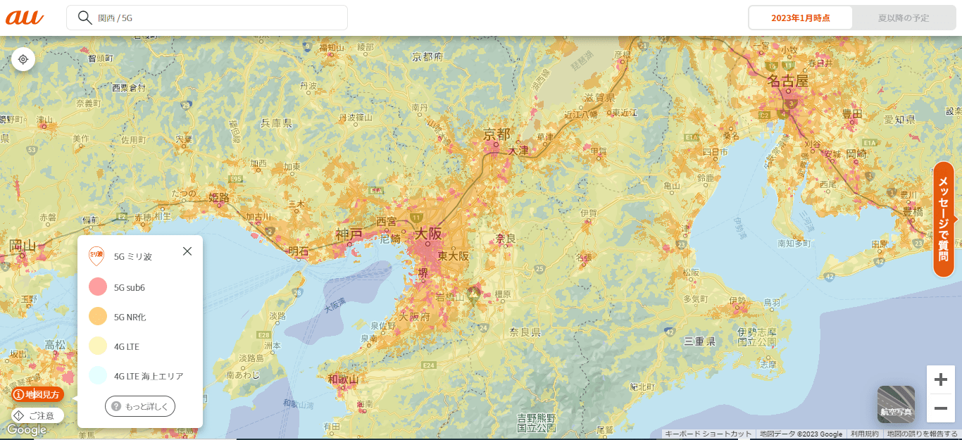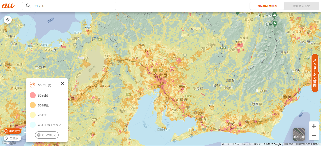 名古屋近郊では西側の山間部以外の市街地は黄色4G LTEエリアになっており、通信に支障がありません。また、名古屋中心部では5Gサービスも使用可能です。