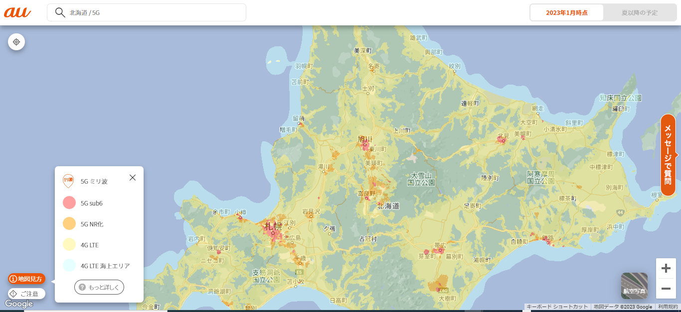 北海道中心部では、札幌周辺の南西側山間部を除けばほぼ通信可能な黄色エリアです。よって市街地の通信はまったく問題がないことが分かります。