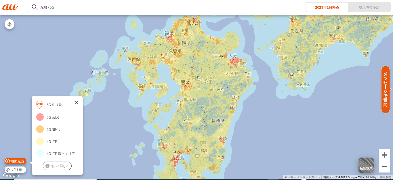 主要都市の福岡市、北九州市を含む市街地では通信サービスは黄色エリアであり全く問題ありません。