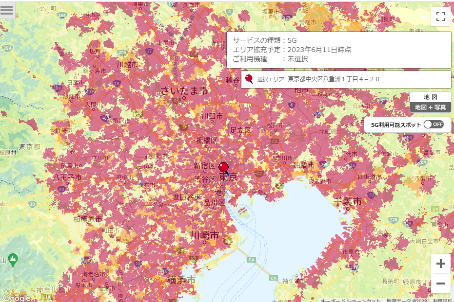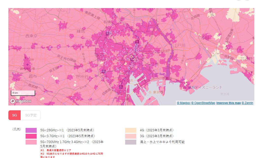 但し、首都圏で比較すると4Gpovoと同じですが、5Gpovoの方がやや広いようです。
