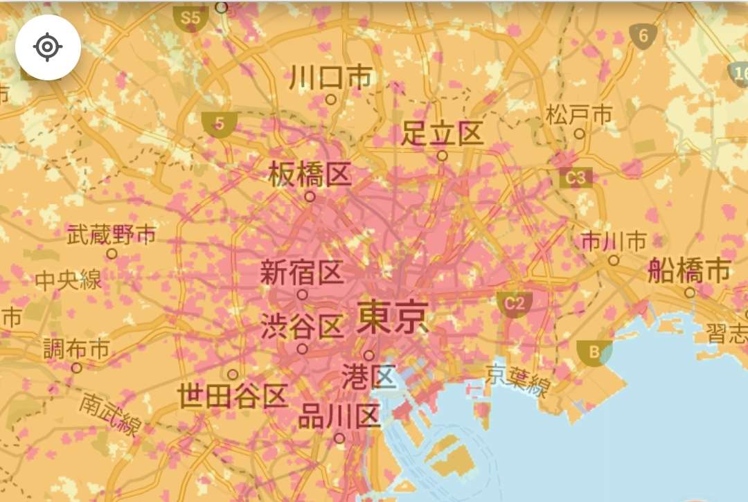 上図のように、首都圏エリア(東京近郊)は西の山間部以外は黄色の4G LTEエリアのため問題はありません。