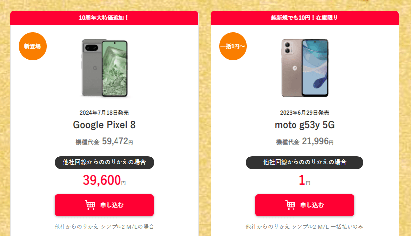 例えばモトローラのmoto g53y 5Gは、ソフトバンク、ワイモバイル、LINEMO、その他ソフトバンク回線格安SIMを除く他社から乗り換えで契約し、シンプル2MまたはLに加入するという条件を満たすと一括1円になります。