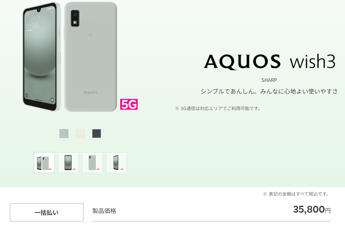 楽天モバイルの法人向けプランでは、AQUOS wish3 を一括35,800円で購入できるなど、様々な端末とのセット購入にも対応しています。