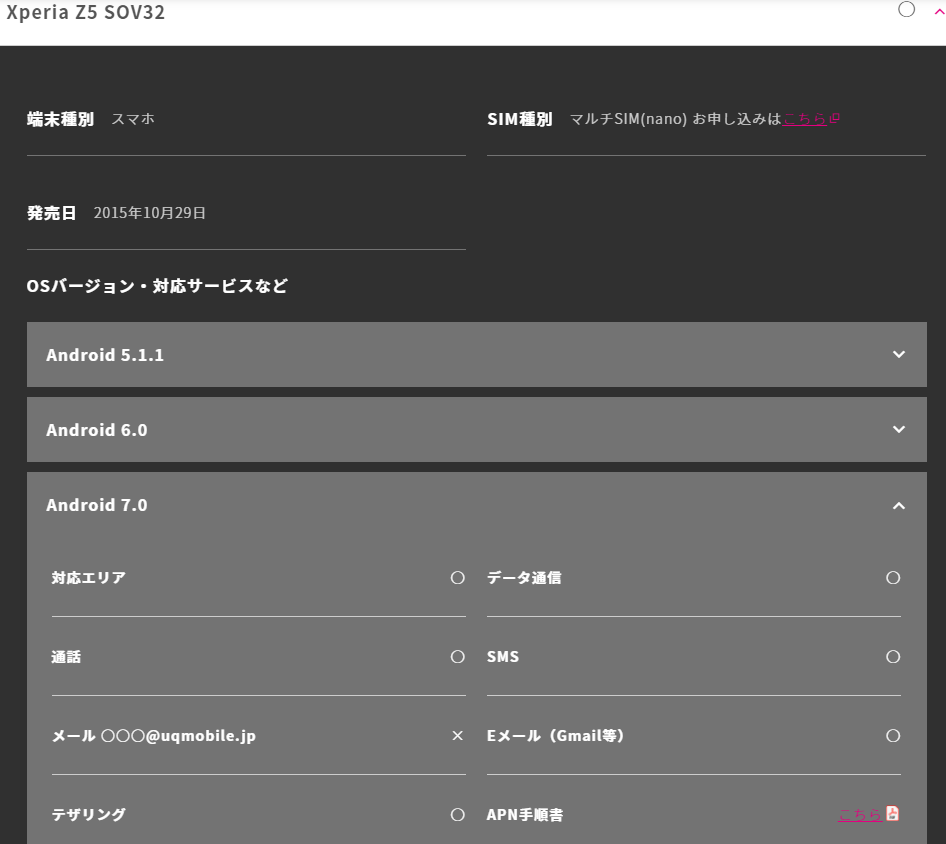 例えばau版のXperia Z5では、UQモバイルのメールサービス(月額220円の有料オプション)に非対応でした。
