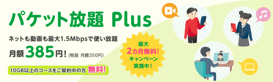 mineoでは10GB以上のプランはなら無料、その他のプランは月額385円で「パケット放題Plus」が使えます。