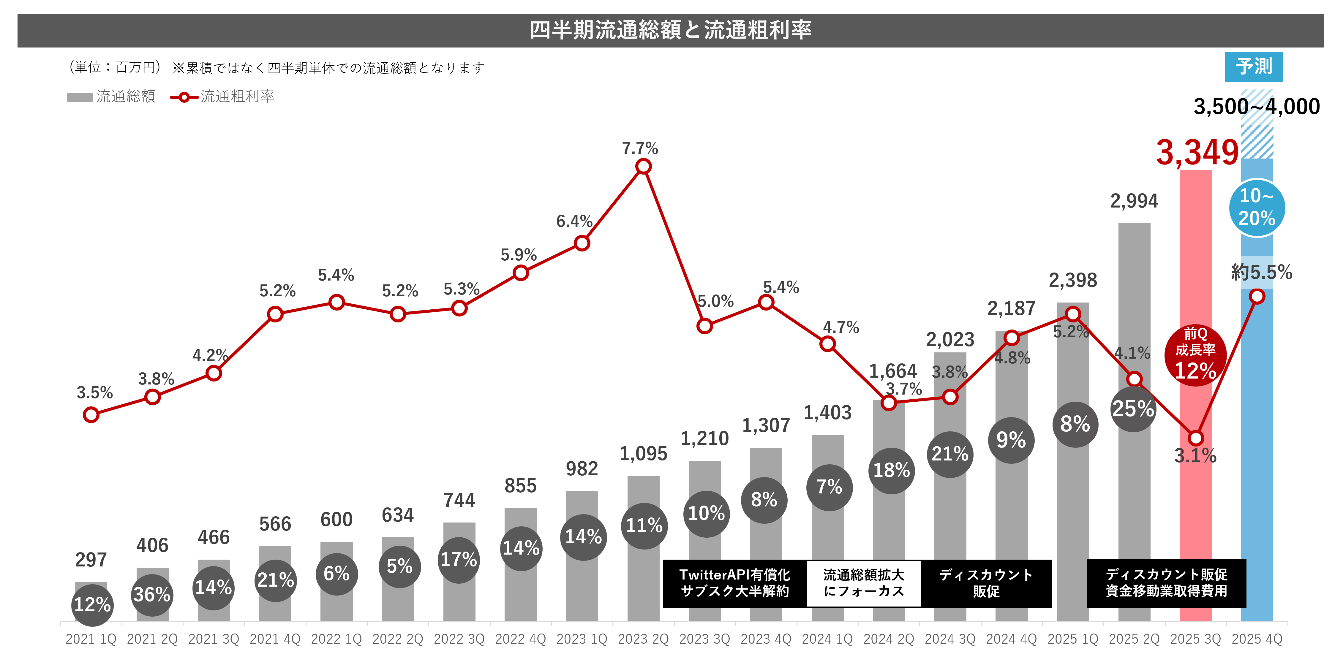 2025年9月期第3四半期においては前四半期対比112%、流通総額約34億円へ到達いたしました。流通総額1,000億達成に向けて、「3万円以下のto C現金支払い」を、①広告領域 ②人材領域 ③金融領域の3軸にて網羅を目指してまいります。各領域における取り組みを強化し、2027年9月期に掲げている流通総額1,000億円を達成することで、圧倒的低手数料を実現し、より多くの企業様にご利用いただけるよう、更に邁進してまいります。