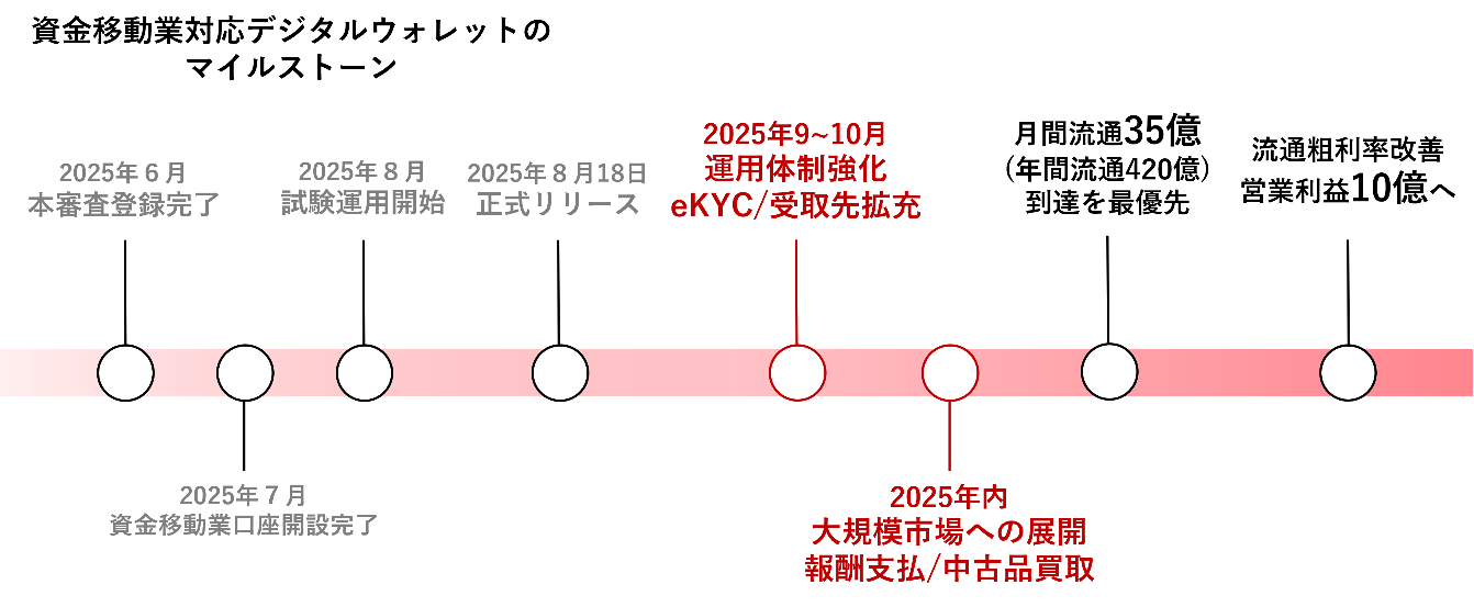 まずはこの「月間流通35億円」のベースを固めることを最重要課題と位置づけ、流通拡大を最優先に取り組んでまいります。デジタルウォレットの立ち上げフェーズにおいては流通粗利率よりも流通規模の拡大を重視した事業運営を進めてまいります。その後、月間流通35億円到達後のフェーズで、利益率の改善を段階的に進めていくことで、年間営業利益10億円を目指します。