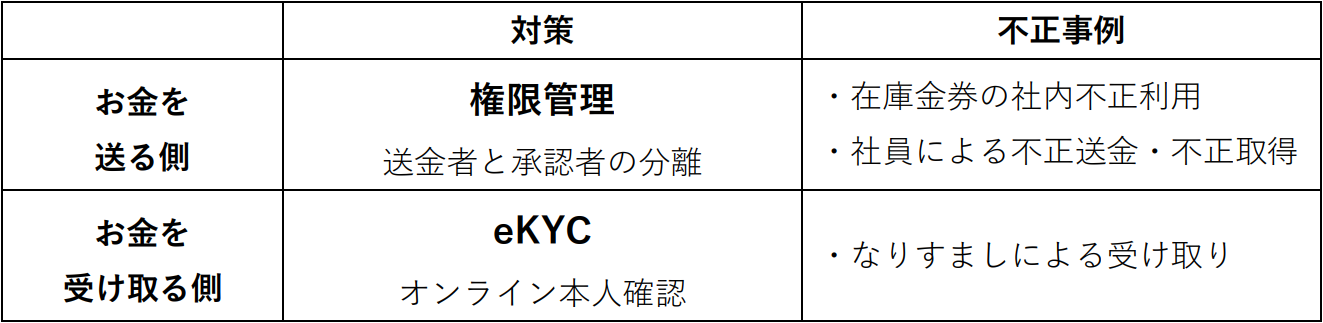 当社は、お金を送る側・受け取る側への不正対策として、権限管理、eKYCを提供しています。