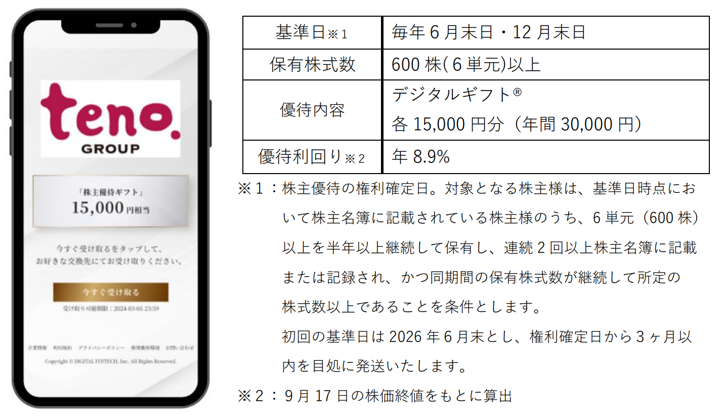 株式会社テノ.ホールディングス(代表取締役社長:池内 比呂子、東証スタンダード市場・福証本則市場:証券コード7037)において、株式会社デジタルプラス(代表取締役社長:菊池 誠晃、本社:東京都渋谷区、東証グロース市場:証券コード3691)の子会社である、株式会社デジタルフィンテック(代表取締役社長:菊池 誠晃、本社:北海道札幌市)が運営する「デジタルギフト®︎」を株主優待としてご活用いただくことになりました。