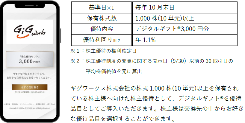 ギグワークス株式会社(代表取締役社長:村田 峰人、東証スタンダード市場:証券コード2375)において、株式会社デジタルプラス(代表取締役社長:菊池 誠晃、本社:東京都渋谷区、東証グロース市場:証券コード3691)グループが運営する「デジタルギフト®︎」を株主優待としてご活用いただくことになりました。