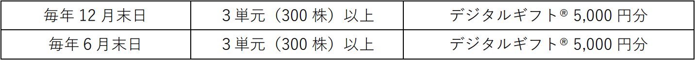 ※ 半年以上の継続保有とは、同じ株主番号で12月31日及び6月30日時点の当社株主名簿に、連続して2回以上記載または記録されていることを指します。