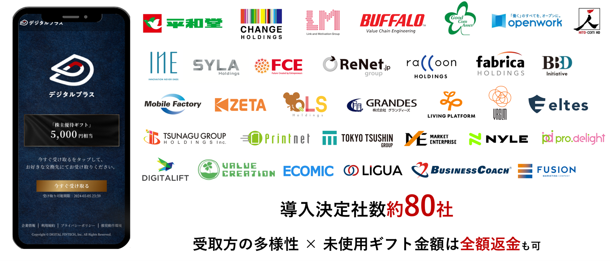 株式会社デジタルプラス(代表取締役社長:菊池 誠晃、本社:東京都渋谷区、東証グロース市場:証券コード3691)グループは、デジタルギフト®︎を活用し、これまでに80社を超える株主優待のデジタル化を支援してまいりました。