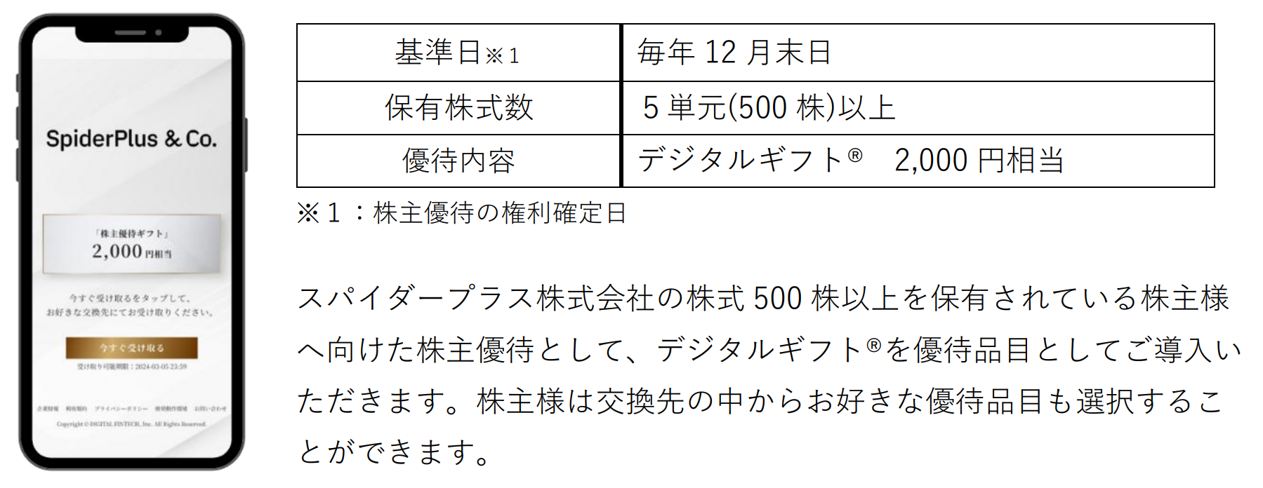 スパイダープラス株式会社(代表取締役社長:伊藤 謙自、東証グロース市場:証券コード4192)において、株式会社デジタルプラス(代表取締役社長:菊池 誠晃、本社:東京都渋谷区、東証グロース市場:証券コード3691)グループが運営する「デジタルギフト®︎」を株主優待としてご活用いただくことになりました。
